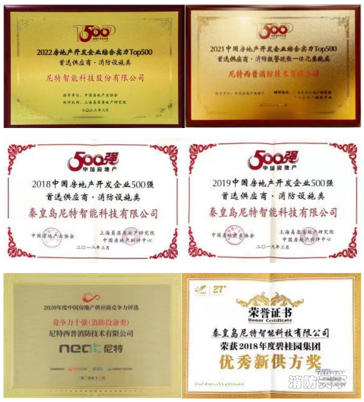 2020-2022年尼特連續3年獲評為中國房地產開發企業500強“消防報警疏散一體化系統類”首選供應商